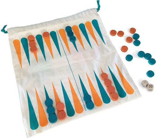 1 vászontáska nyomott mintával (játéktábla), 30 fából készült korong, 2 fa dobókocka.