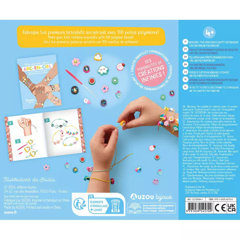 Ezzel a készlettel szivárványos karkötők készíthetők 100 különböző formájú és mintájú polimer gyöngyből és rugalmas gumi fonalból! Az Auzou márka új készletében található könnyen felfűzhető gyöngyök végtelen számú alkotási lehetőséget biztosítanak!