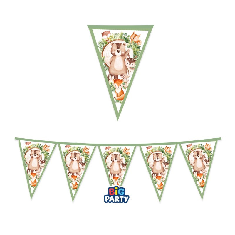 Egészítsd ki az ünnepi dekorációt ezzel az aranyos zászlófüzérrel, amely erdei állatok sokaságát ábrázolja.