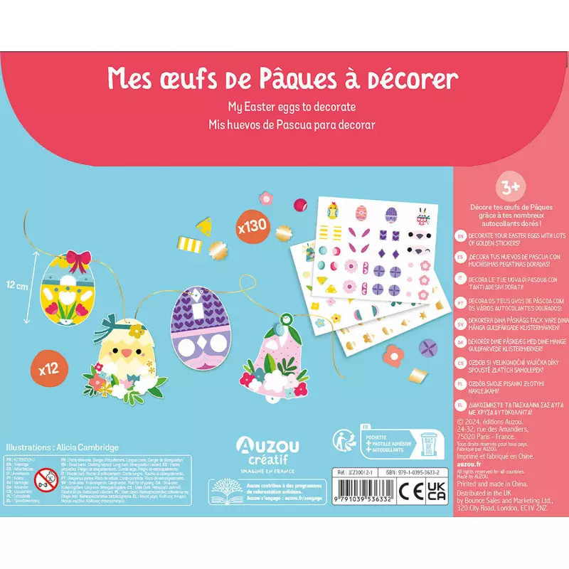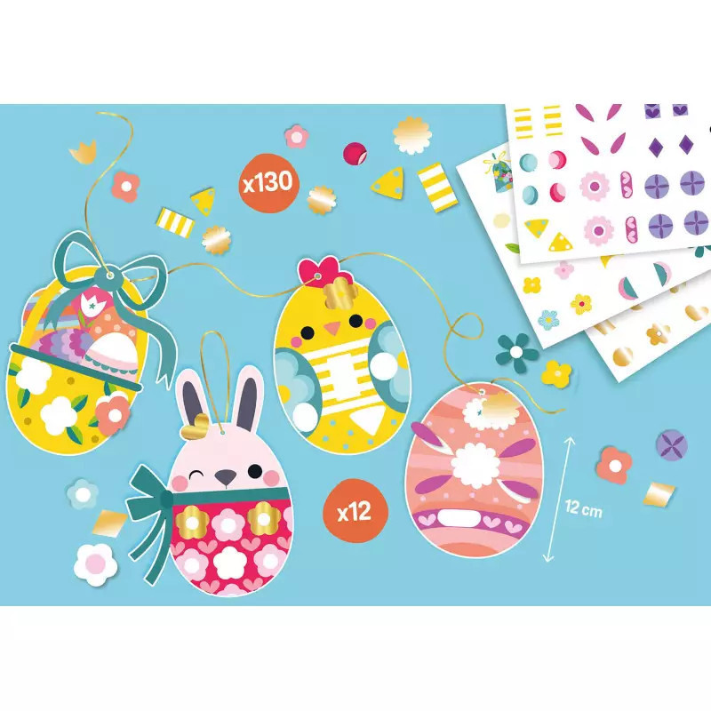 Ezzel a készlettel a gyerekek 12 féle húsvéti papírtojást díszíthetnek fel az arany színű matricák segítségével, majd egy hosszú füzérré alakíthatják az alkotást, amely szép dekorációja lehet a lakás bármely pontjának vagy a gyerekszobának.
