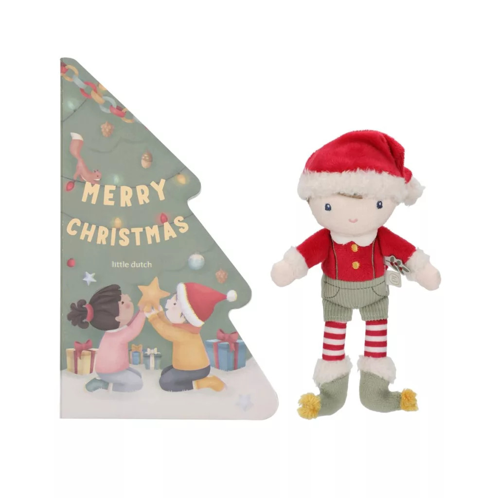 Az ajándékszett egy mini változatot tartalmaz a Little Dutch „Majdnem karácsony!” című karácsonyi könyvéből, valamint egy kis karácsonyi Jim babát