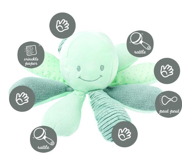 Ez a polip lesz a baba első igazi barátja, megnyugtatja, biztonságérzetet és kényelmet ad neki. A polip a születésétől kezdve megfelelő barátja a babának, és egész gyermekkorában hűséges társként és barátként kíséri őt. A polip puha és kellemes tapintású anyagból készült.