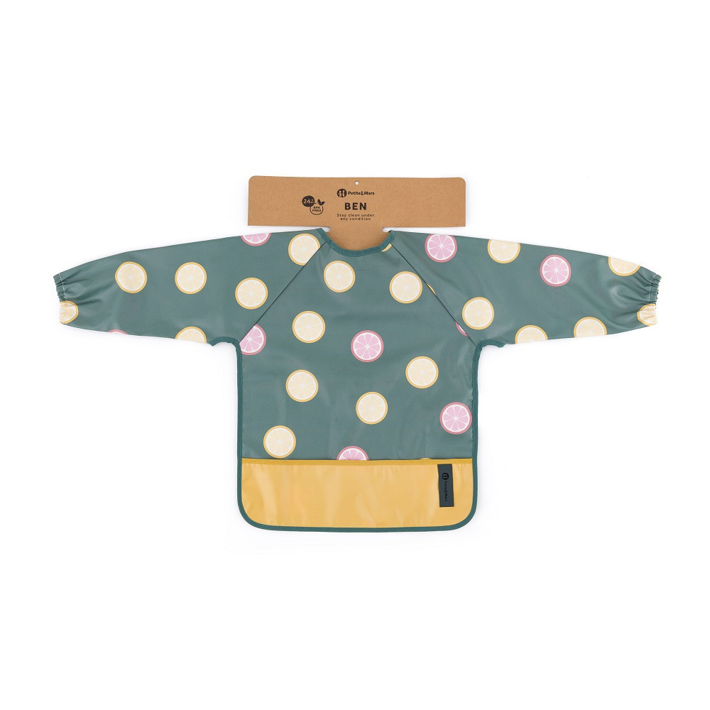 A kényelmes, vízálló, hosszú ujjú előke gyorsan száradó, biztonságos PU anyagból készült, amely teljesen PVC- és ftalátmentes. Az elülső morzsazseb biztosítja a rendet és a kényelmet etetés közben, a hosszú ujjú, elasztikus pánttal ellátott ujjak pedig megvédik a ruhát a szennyeződéstől és a nedvességtől. Az előke nagyon puha tapintású, és puha tépőzárral rögzíthető. Nemcsak evéskor, hanem művészi alkotások készítésekor is használható. A tisztán tartásához használat után egyszerűen törölje le nedves ruhával.
