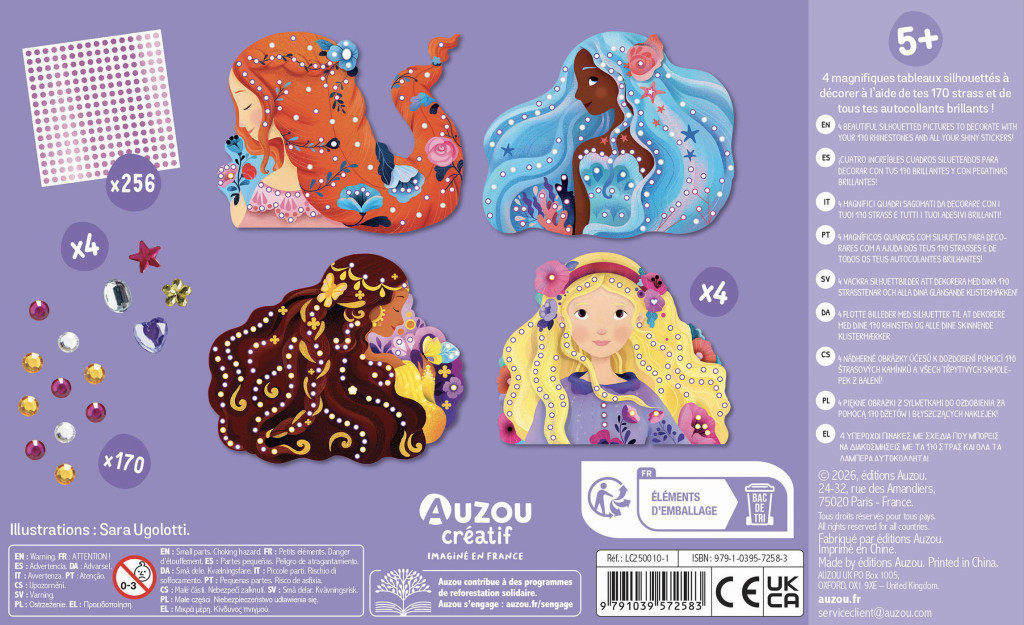 Készíts különleges frizurákat, amelyet számos strasszal és csillogó matricával dekorálhatsz ezzel a meseszép Auzou kreatív készlettel. A csomagban 4 db dekorálható képet, 256 db matricát és több, mint 170 öntapadós strasszkövet tartalmaz.
