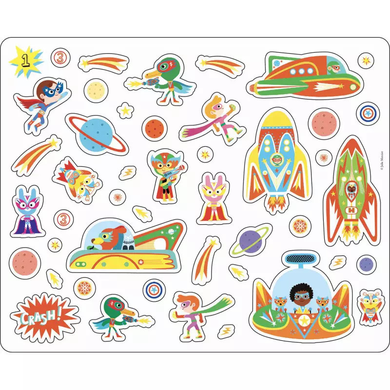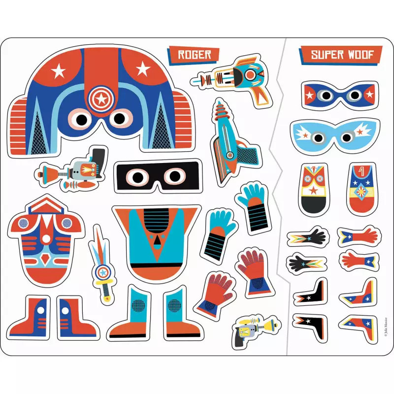 A csomag 6 db hátteret és 200 db áthelyezhető, újra felhasználható szuperhősös matricát tartalmaz, mellyel a gyerekek jól szórakozhatnak, miközben történeteket kreálhatnak.