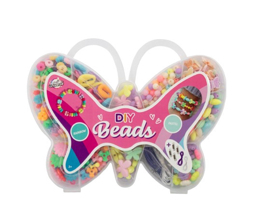 Szivárványos és pasztell színű gyöngyfűző készlet pillangó alakú dobozban.